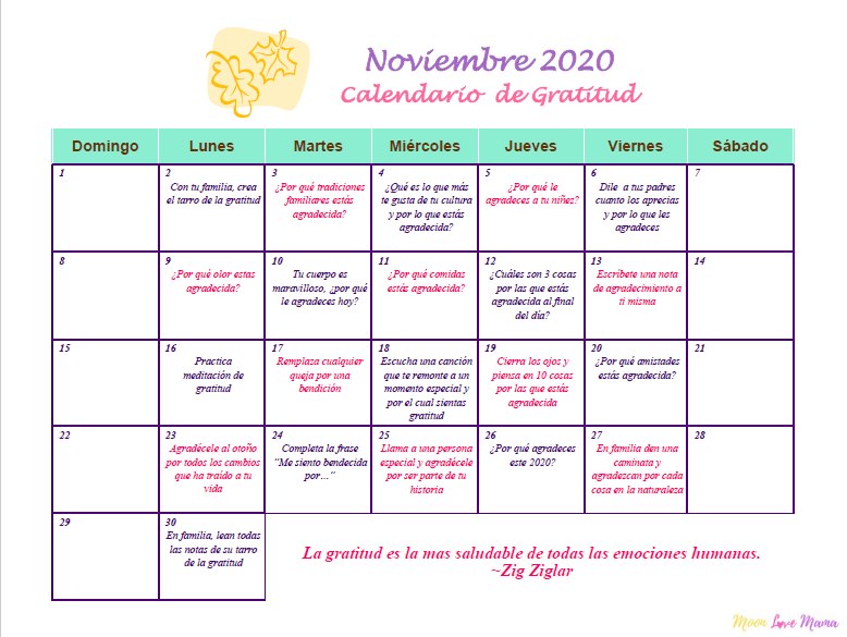 Noviembre está aquí y también nuestro calendario de mindfulness… Este mes celebramos Acción de Gracias y por lo tanto nuestro calendario se trata de agradecer por todas las cosas en nuestras vidas.
